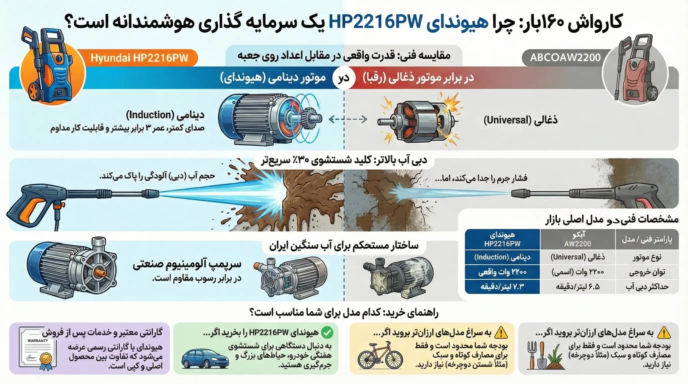 یکی از پرتکرارترین کلمات در هنگام خرید کارواش خانگی، واژه دینامی (Induction) است. اما چرا مدل HP2216PW هیوندای با وجود وزن بیشتر، محبوبتر است؟
