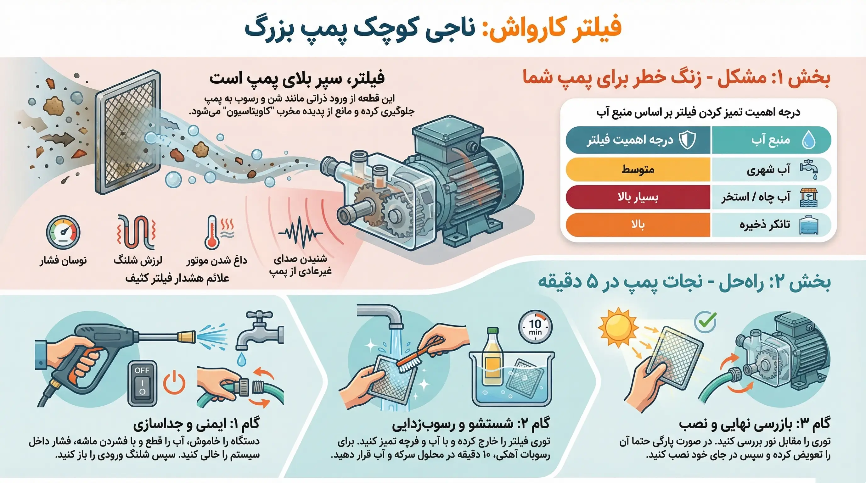 نادیده گرفتن فیلتر ورودی آب، مانند رانندگی بدون فیلتر روغن است. شاید در چند روز اول متوجه چیزی نشوید، اما رسوبات و ذرات میکروسکوپی موجود در آب به تدریج پمپ سرامیکی یا استیل دستگاه شما را از درون میتراشند. در این مقاله جامع، ما از نگاه یک تکنسین با ۱۰ سال سابقه، تمام آنچه باید درباره نگهداری، تشخیص خرابی و نظافت فیلتر ورودی بدانید را بررسی کردهایم.