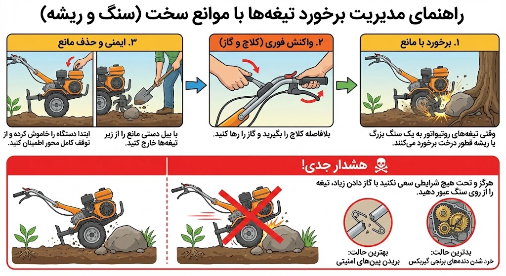 💡 پیشنهاد مهندسی: همیشه قبل از کار، با یک بیل کوچک رطوبت خاک را چک کنید؛ خاک باید نمدار باشد اما به بیل نچسبد. همچنین سنگهای بزرگ را از مسیر بردارید تا از شکستن ناگهانی تیغههای روتیواتور جلوگیری شود.
