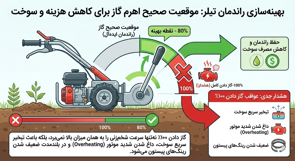 استفاده درست از تیلر فقط برای سلامت قطعات نیست؛ بلکه به طور مستقیم روی کیف پول شما (هزینه سوخت و استهلاک قطعات مصرفی) تاثیر میگذارد. یک اپراتور هوشمند میداند که چگونه با کمترین فشار به موتور، بیشترین حجم خاکورزی را انجام دهد.