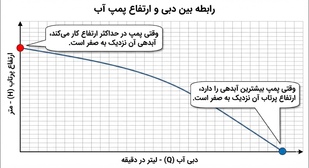 ۲. تناسب بین دبی (آبدهی) و ارتفاع