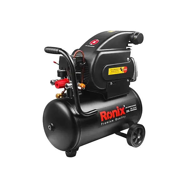 کمپرسور باد یکی از تجهیزات اصلی برای تأمین نیروی مورد نیاز ابزارهای بادی یا پنوماتیک است و با فشردهسازی هوا، امکان استفاده از ابزارهای متنوع در کارگاهها و صنایع مختلف را فراهم میکند و از سری تجهیزات خانگی و صنعتی می باشد. این دستگاه هوا را در فشار مشخصی مکیده و در فشار بالاتر تحویل میدهد.کمپرسور باد رونیکس مدل RC2510 با مخزن ۲۵ لیتری و موتور ۲ اسب بخار، قدرت کافی برای انجام طیف گستردهای از فعالیتهای صنعتی و نیمهصنعتی دارد و برای کاربران حرفهای گزینهای کاربردی محسوب میشود. این کمپرسور با حداکثر فشار ۸ بار، هوای کافی را در مخزن ذخیره میکند تا ابزارآلات بادی در زمان کارکرد، عملکرد پایدارتری داشته باشند. طراحی جمعوجور به همراه دو چرخ، حمل دستگاه را سادهتر کرده و برای محیطهای کارگاهی گزینه مناسبی است. وجود تنظیمکننده جریان هوای خروجی و دو کوپلر سریع باعث اتصال سریعتر ابزارها و افزایش کارایی میشود. همچنین سیستم قطعکن حرارتی اتوماتیک، سوئیچ اتوماتیک روشن/خاموش اهرمی و سوپاپ اطمینان، نقش مهمی در ایمنی و طول عمر دستگاه دارند.