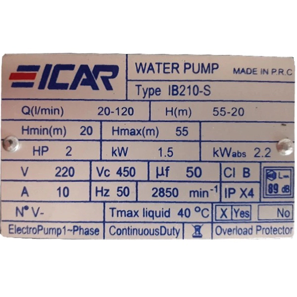 معرفی پمپ آب دو پروانه ایکار 2 اسب بخار مدل IB210-S