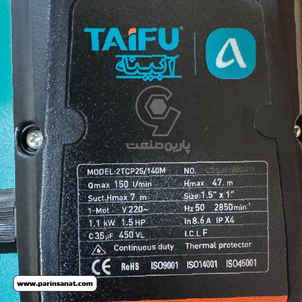 پمپ آب بشقابی تایفو مدل 2TCP25140M از سری پمپ و تجهیزات آبرسانی با قدرت موتور 1.5 اسب بخار و توان 1.1 کیلووات، راهکاری قدرتمند برای تأمین و تقویت فشار آب در مصارف خانگی، نیمهصنعتی و باغی است. موتور تکفاز 220 ولت با فرکانس 50 هرتز و سرعت 2850 دور در دقیقه، راندمان بالا و عملکرد یکنواخت را تضمین میکند. حداکثر دبی 150 لیتر در دقیقه برای انتقال حجمهای زیاد آب در زمان کوتاه ایدهآل است و حداکثر هد 47 متر پاسخگوی تامین فشار در ساختمانهای چند طبقه و خطوط طولانی میباشد. قابلیت مکش تا عمق 8 متر، امکان استفاده از چاهها و منابع کمعمق را فراهم میکند و اتصالات ورودی 1.5 اینچ و خروجی 1 اینچ، انعطافپذیری مناسبی در طراحی سیستم لولهکشی میدهد. ساختار بشقابی، جریان پایدار با صدای کم را ارائه میکند. این پمپ برای راهاندازی ایستگاههای پمپاژ کوچک، آبیاری باغها و تأمین آب واحدهای مسکونی و ویلایی انتخابی مطمئن است.