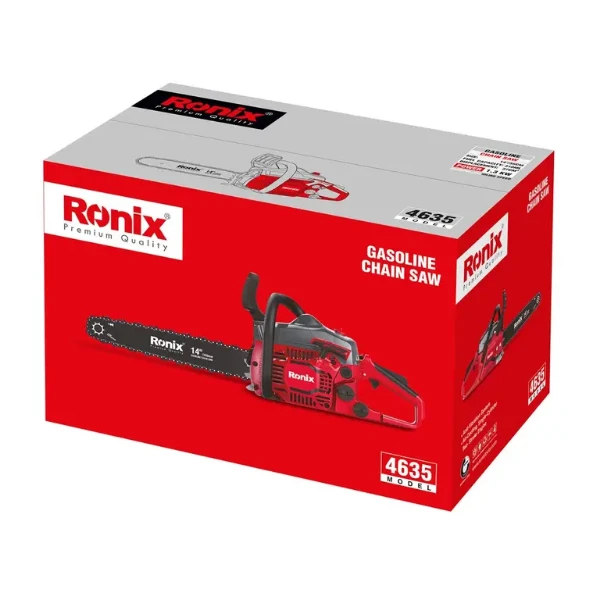 اره موتوری بنزینی رونیکس مدل 4635 با توان ۱۴۰۰ وات از سری تجهیزات کشاورزی و باغبانی می باشد و مجهز به سیستم روغنکاری خودکار زنجیر است که با کاهش اصطکاک بین ساطور و زنجیر، عملکرد ایمن و روان دستگاه را تضمین میکند. موتور تکسیلندر دوزمانه با حجم ۳۸.۲ سانتیمتر مکعب، توان تولید سرعت ۳۰۰۰ دور بر دقیقه در حالت آزاد و ۸۵۰۰ دور بر دقیقه هنگام برش را دارد.