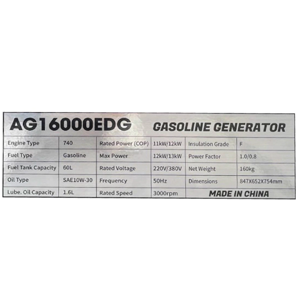 مشخصات فنی موتور برق بنزینی آگرو مدل AG16000EDG