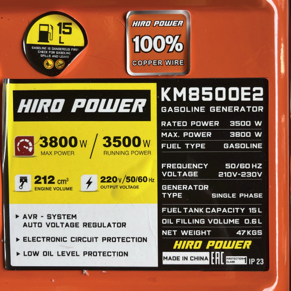مشخصات فنی موتور برق بنزینی هیرو پاور مدل KM8500E2