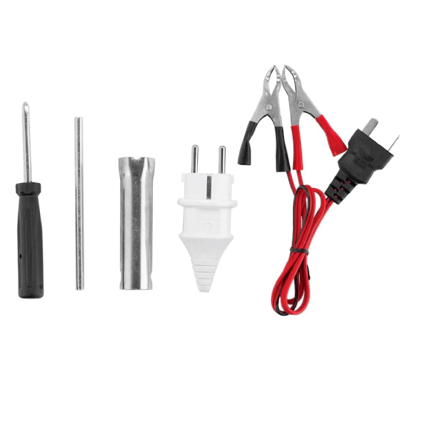 - متعلقات: دو شاخه، کابل اتصال DC، آچار شمع، پایه لاستیکی با مهره