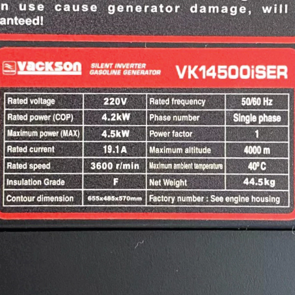 مشخصات فنی موتور برق بنزینی واکسون ۴.۵ کیلووات مدل VK14500ISER