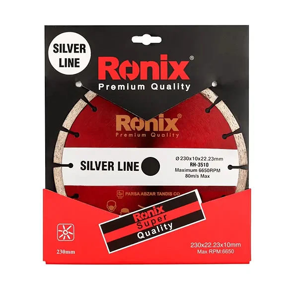 صفحه گرانیتبر رونیکس مدل RH3510 یک صفحه برش حرفهای برای کارهای ساختمانی و سنگبری است که از سری تجهیزات خانگی و صنعتی میباشد. این صفحه با قطر 230 میلیمتر برای برش گرانیت و سنگ مرمر طراحی شده و در پروژههایی مانند نمای ساختمان، کارهای سنگکاری و نصب سنگهای طبیعی کاربرد زیادی دارد. تولید این صفحه با روش Cold Press و توسط ماشینآلات تمام اتوماتیک انجام شده که باعث افزایش مقاومت صفحه در برابر فشار و همچنین افزایش طول عمر آن در برش سطوح متراکم میشود. استفاده از فرمولاسیون پیشرفته در بخش الماسه نیز باعث یکنواخت ماندن کیفیت برش و ایجاد برشی خنکتر میشود.