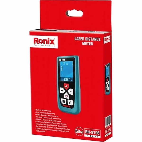 از نظر ویژگیها، متر لیزری رونیکس RH9196 به نمایشگر تمام رنگی مجهز است که امکان درشتنمایی اعداد و خوانایی عالی در محیطهای کمنور یا بدون نور را فراهم میکند. قابلیت ثبت و ذخیرهسازی تا 50 محاسبه، به مدیریت بهتر اطلاعات اندازهگیری کمک میکند. همچنین سیستم قطع اتوماتیک لیزر در 30 ثانیه و خاموشی خودکار دستگاه پس از 180 ثانیه باعث صرفهجویی در مصرف باتری میشود. طراحی خوشدست و وزن سبک به همراه اقلام همراه مانند کیف برزنتی و بند دستی، استفاده و حمل دستگاه را آسانتر میکند.