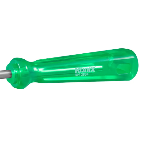 نوک ۶ میلیمتری سختکاری شده و مغناطیسی، برای پیچهای متوسط تا بزرگ مناسب است و ویژگی آهنربایی آن، کار با پیچها را راحتتر کرده و از افتادن آنها جلوگیری میکند. دسته کریستالی PVC با طراحی ارگونومیک، گرفت راحت و کنترل مناسب را فراهم میکند و طراحی حرفهای رونیکس، تعادل بین سرعت و گشتاور را بهینه کرده است.