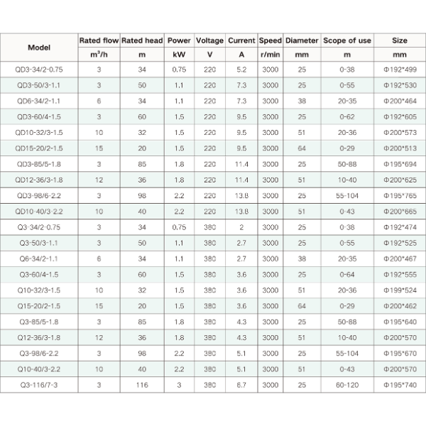 مشخصات فنی کفکش تایفو QD10-40/3-2.2